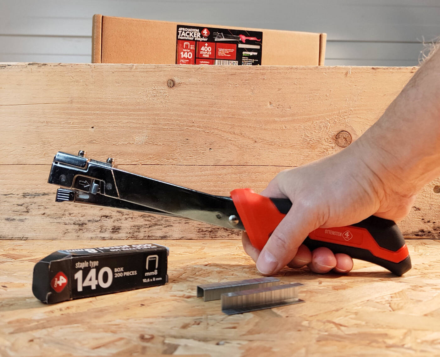 Kartu su 4PRO14014 įrankiu gausite 400vnt. 140 tipo sąvaržėlių pakuotę ( 200vnt. 6 mm ir 200vnt. 8 mm sąvaržėlių).