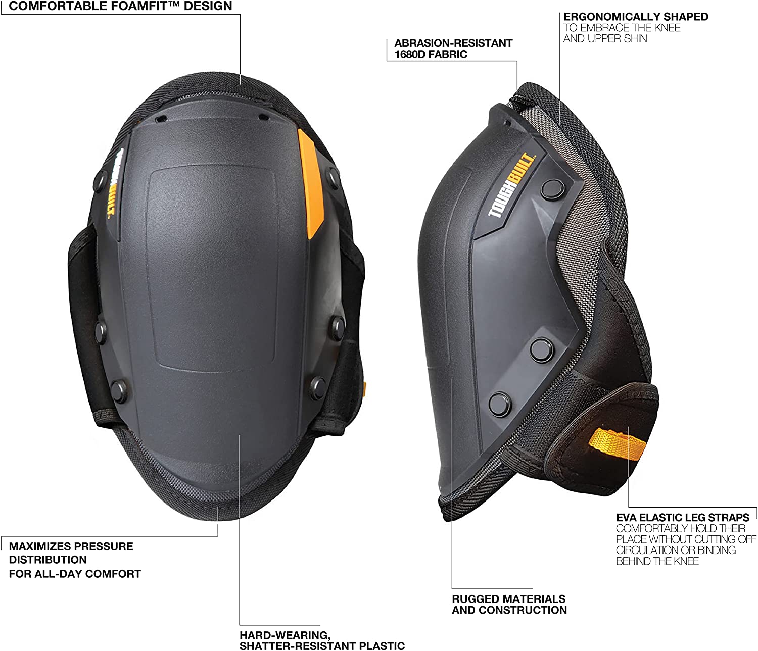 "ToughBuilt FoamFit™ kelių apsaugos iš naujo apibrėžia, kaip profesionalai naudoja kelio įtvarus. Tvirtas, dilimui atsparus SnapShell apvalkalas apsaugo kelį nuo šiurkščių paviršių ir kartu leidžia lengvai judėti į šonus. Ergonomiška putų konstrukcija atitinka natūralią kelio ir blauzdos formą, maksimaliai paskirstydama spaudimą, kad būtų patogu visą dieną. Aukštos šoninės sienelės sumažina kelio nusukimą. EVA elastiniai kojų dirželiai patogiai laikosi savo vietoje, nesutrikdydami kraujotakos ir nesuvaržydami pakinklio. Dėl tvirtų medžiagų ir konstrukcijos šie patikimi kelio įtvarai atlaiko sudėtingiausias darbo sąlygas.