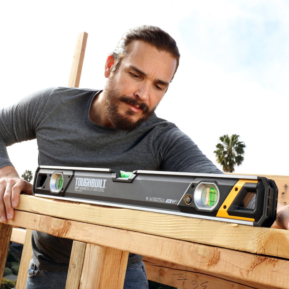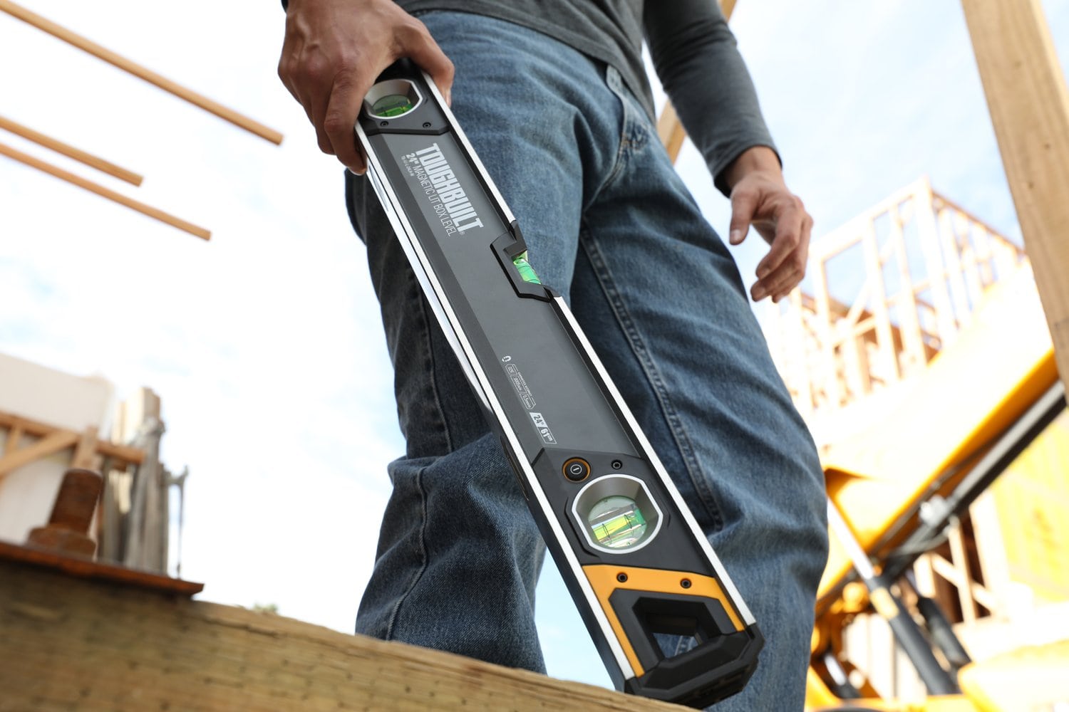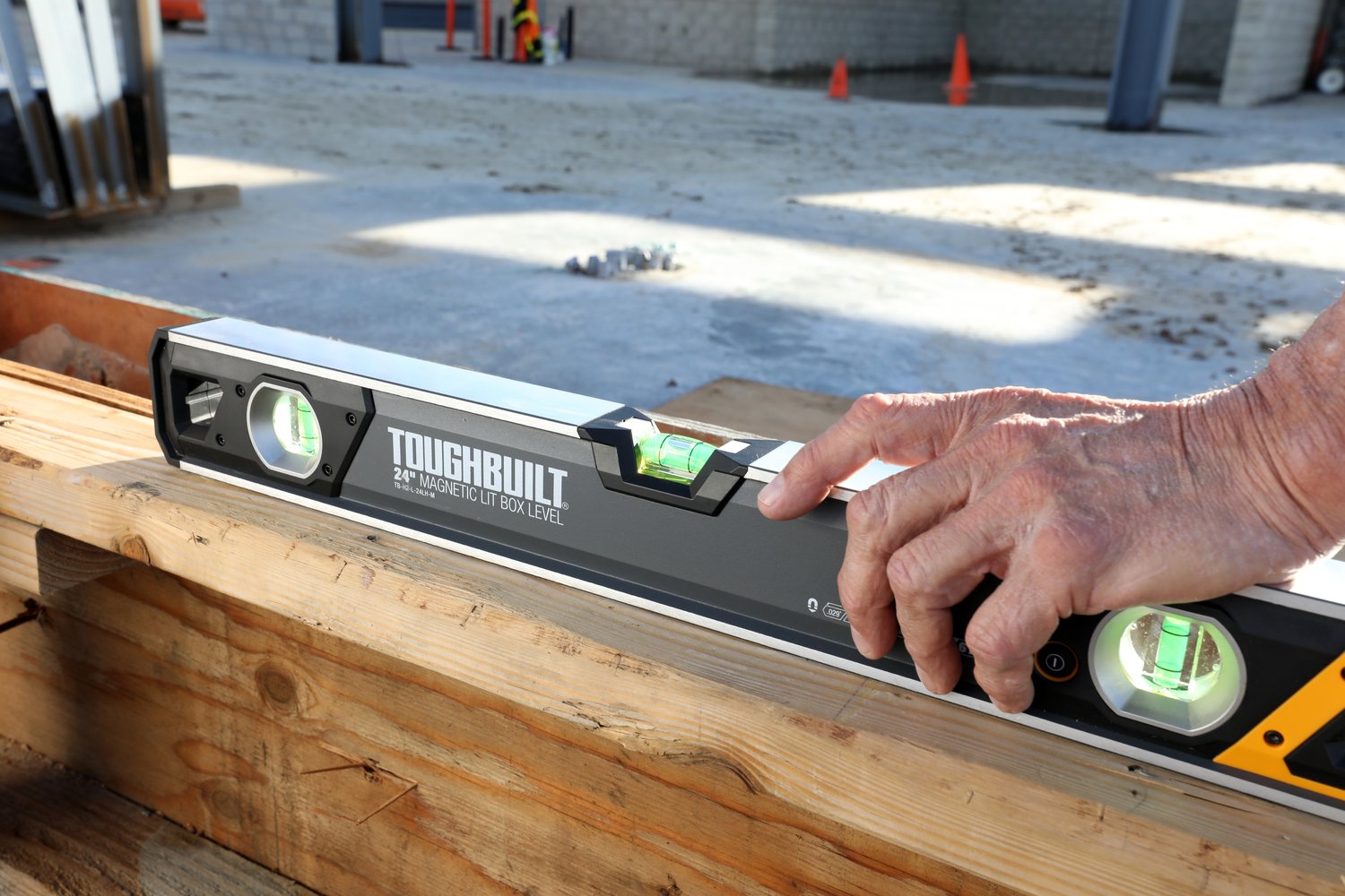 ToughBuilt 60 centimetrų apšviestame magnetiniame gulsčiuke naudojami LED apšviesti buteliukai, kad būtų lengviau įžiūrėti rodmenis.