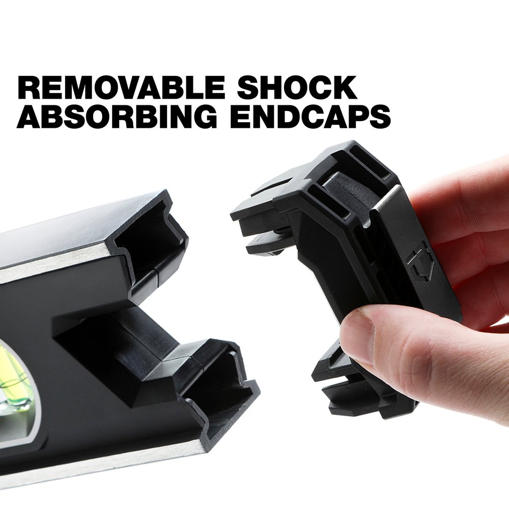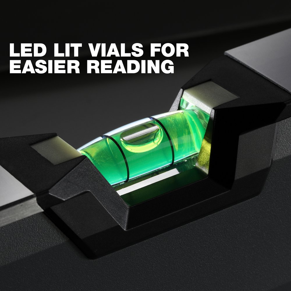 ToughBuilt 120 centimetrų apšviestame magnetiniame gulsčiuke naudojami LED apšviesti buteliukai, kad būtų lengviau įžiūrėti rodmenis.