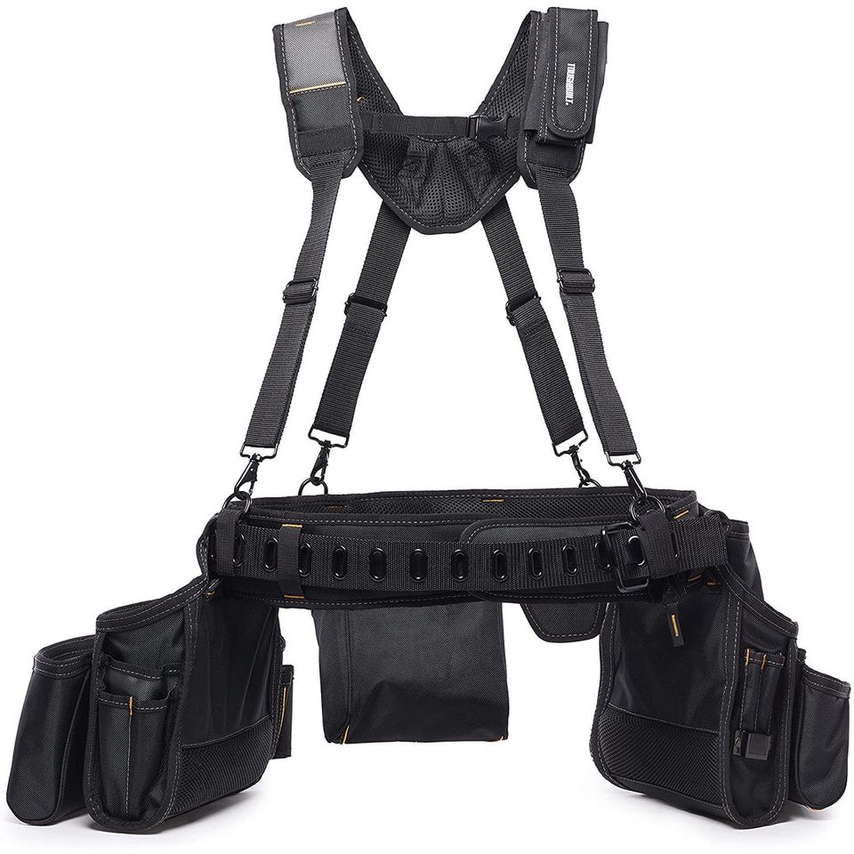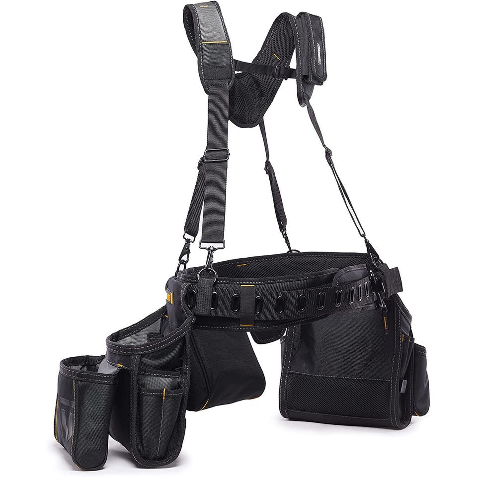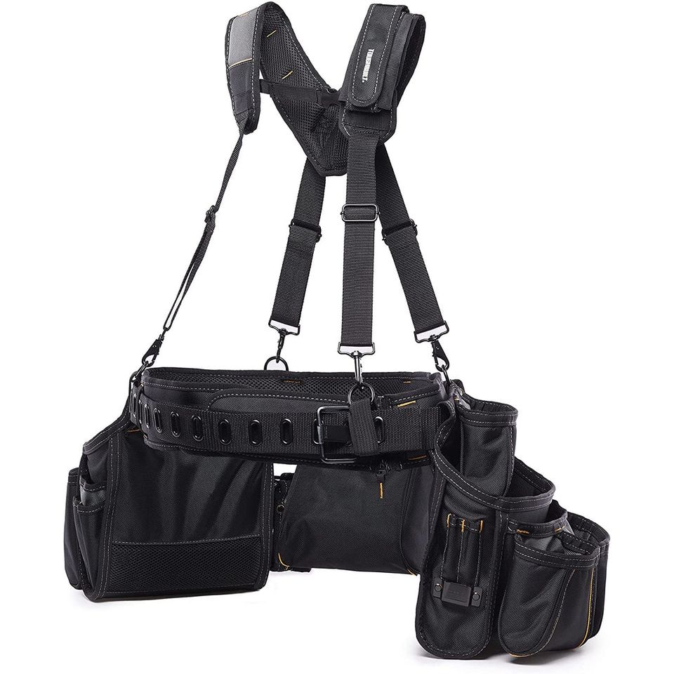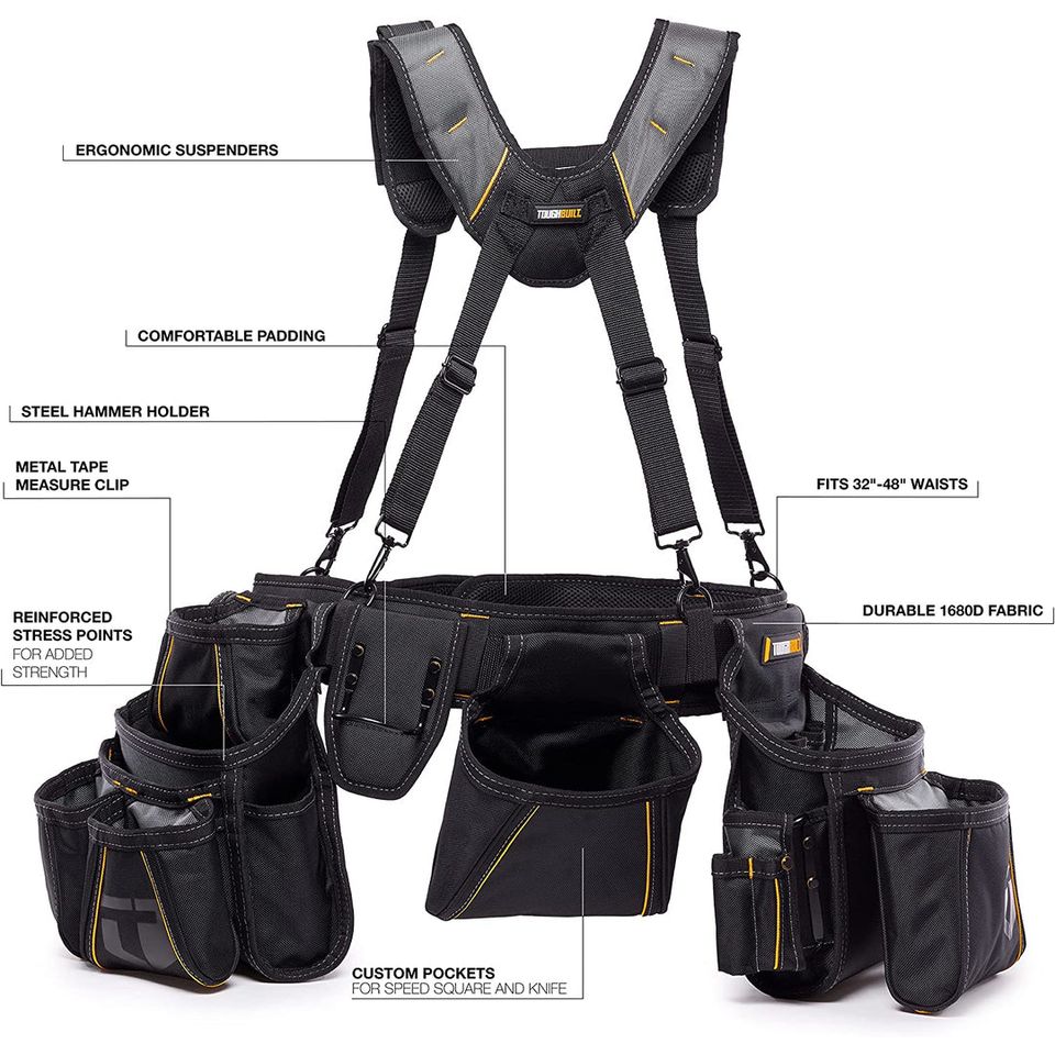 "Toughbuilt TB-301-6 Pro Framer Suspension Rig" yra profesionalus standartinis įrenginys, skirtas tolygiai paskirstyti sunkių krovinių svorį. Paminkštintos petnešos ergonomiškai suprojektuotos taip, kad atitiktų natūralų peties išlinkimą, taip išvengiama karščio taškų, o darbas tampa saugesnis ir patogesnis. Dėklų kišenės išklotos plastiku, todėl išlaiko savo formą ir nesuglemba, tai neleidžia įrankiams iškristi ir užtikrina, lengvą priėjimą prie jų. Paminkštintas diržas yra visiškai reguliuojamas, kad tiktų didesniam ir mažesniam liemeniui. Paminkštintas prailginimas lengvai priglunda prie didesnio liemens, o mažesniam liemeniui jį galima atsegti užtrauktuku. Diržas turi dvigubą žiedinį plaktuko laikiklį. Idealiai tinka profesionaliems naudotojams.