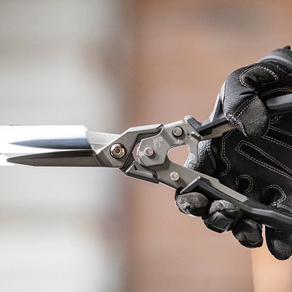 Ergonomiška rankenos konstrukcija, kurios patentas dar nepatvirtintas, sudaro galimybę naudotis 2 kirpimo padėtimis: suėmus galine dalimi, susidaro maksimalus svertas, o suėmus priekine dalimi, užtikrinamas maksimalus valdymas. Įleidžiamas ašies varžtas neužsikabins ant medžiagos, taip užtikrinant patogų naudojimą. Metalinis fiksavimo įtaisas užtikrina įrankio saugų laikymą ir yra lengvai valdomas viena ranka. Šios skardos žirklės sukurtos taip, kad atitiktų griežtus profesionalų reikalavimus, įskaitant daugumą plieninių smeigių ir ortakių.