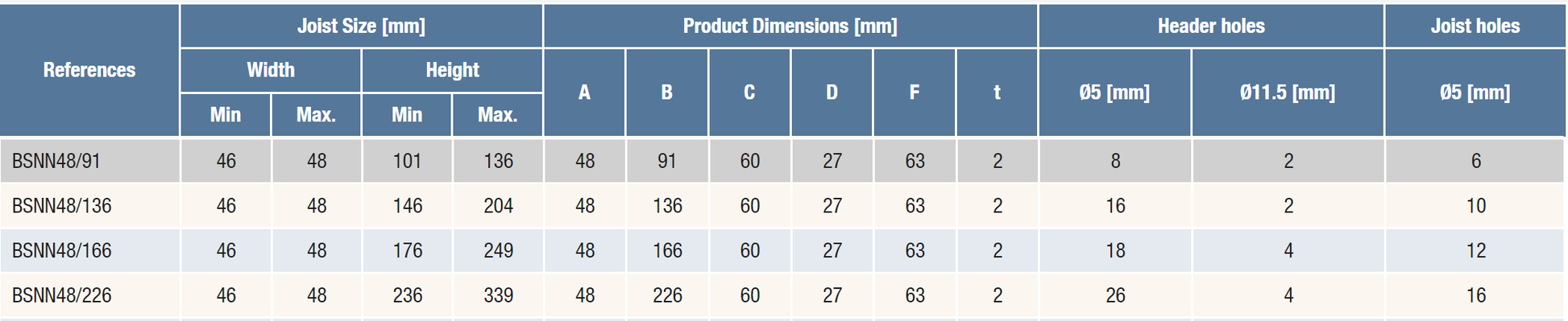 The BSNN series are sturdy holders designed for use in cases where exceptional durability is required. The hangers are attached using CNA system screws, but there are also holes on their surface for 12 mm fasteners. The depth of the hanger must be at least 2/3 of the height of the support element to avoid displacement of the structure, unless additional lateral reinforcement is added to the top of the support element.