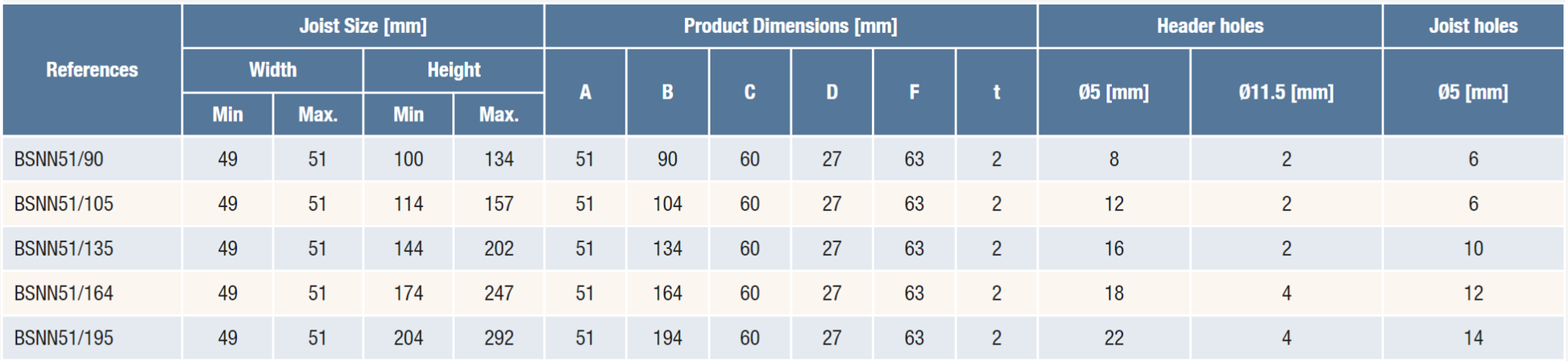 The BSNN series are robust holders designed for use in cases where exceptional durability is required. The hangers are attached using CNA system screws, but their surface also has holes for 12 mm fasteners. The depth of the hanger must be at least 2/3 of the height of the supporting element to avoid structural displacement, unless additional lateral reinforcement is added to the top of the supporting element.