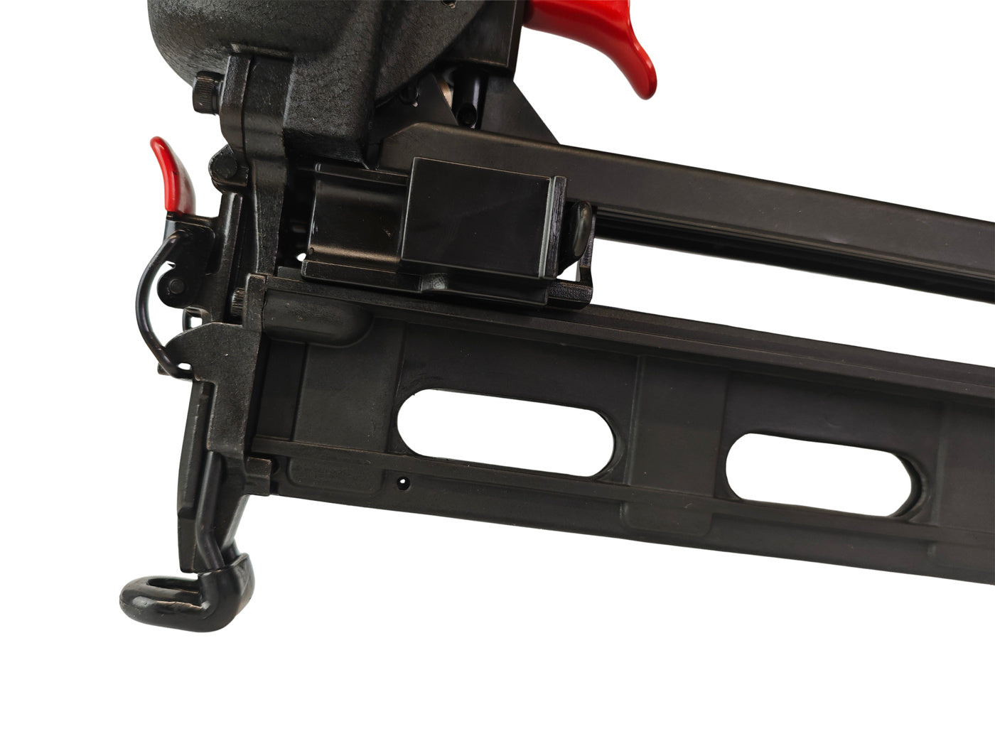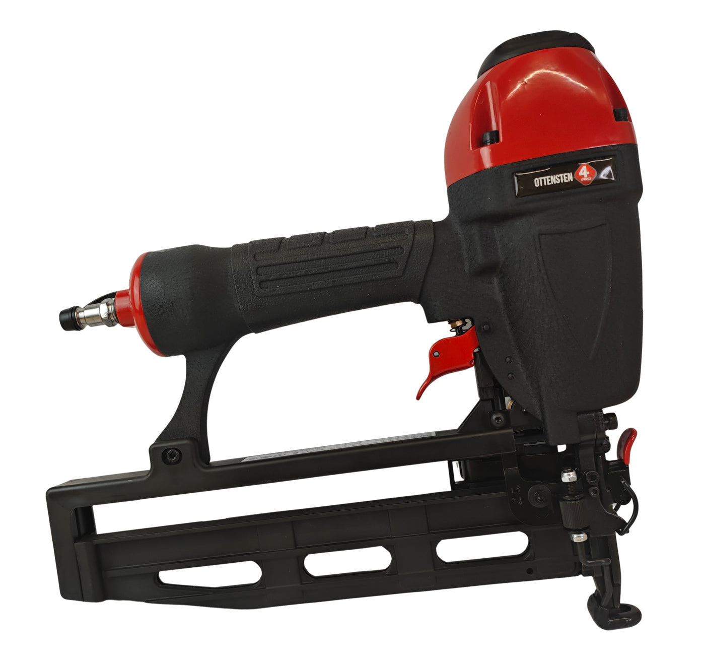 The 4PRO 4PRO1664 is a pneumatic brad nailer designed for driving 1.6 mm brads in the 32-64 mm length range. It features a die-cast aluminum housing for a durable yet lightweight build, depth adjustment for controlled fastening, and a front-opening mechanism for quick removal of jammed brads. The tool includes a comfortable grip, a 360° adjustable air exhaust, and a metal magazine with easy loading and a 100-brad capacity.
