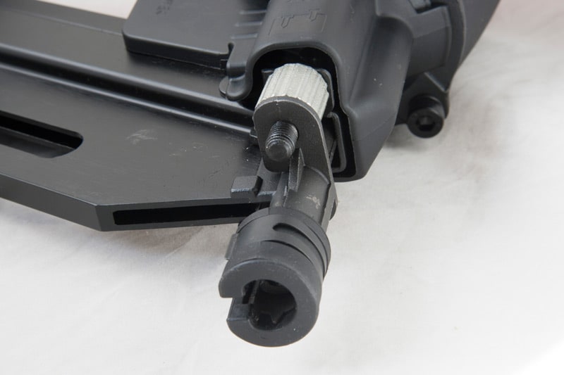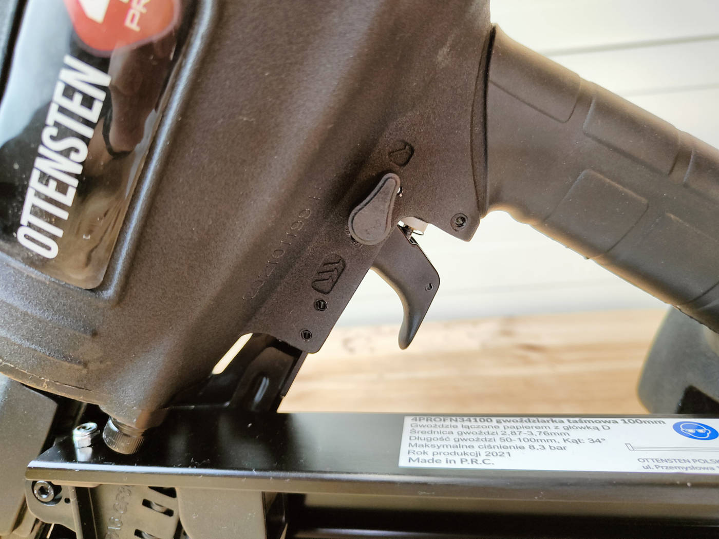 The rear-loaded magazine is made of aluminum, so it is durable and incredibly light. The specially designed nose piece reduces wear and prevents it from slipping even when driving at an angle. The rubber end of the magazine and the rubber-coated body on both sides make the tool safer for the user and protect the processed elements from scratches. The nail gun also has the ability to set the air exhaust in any direction (rotation 360º).