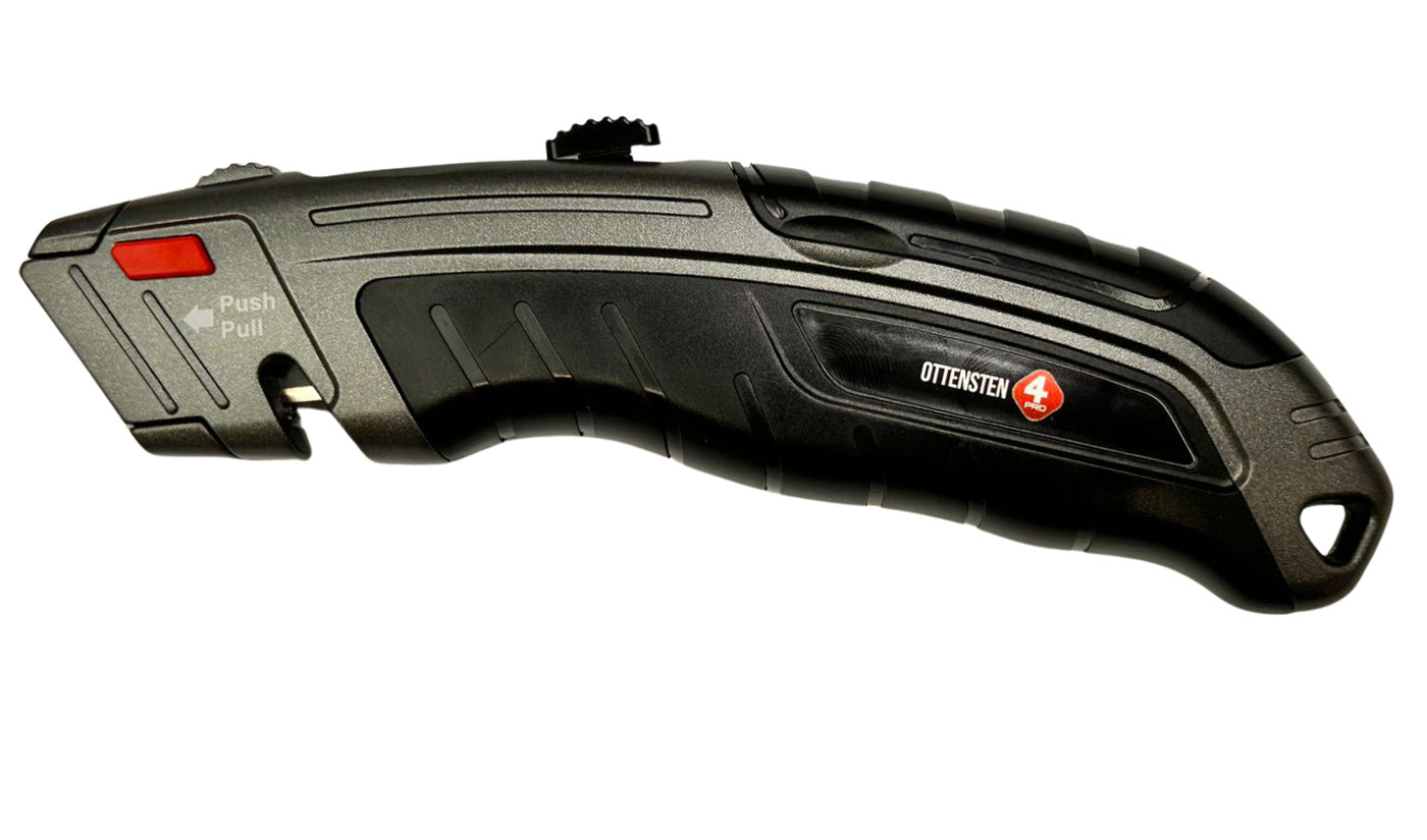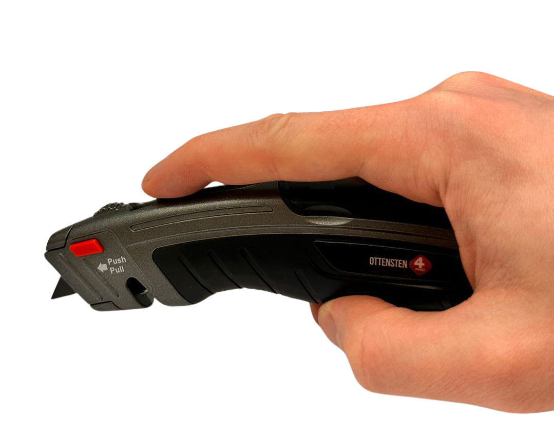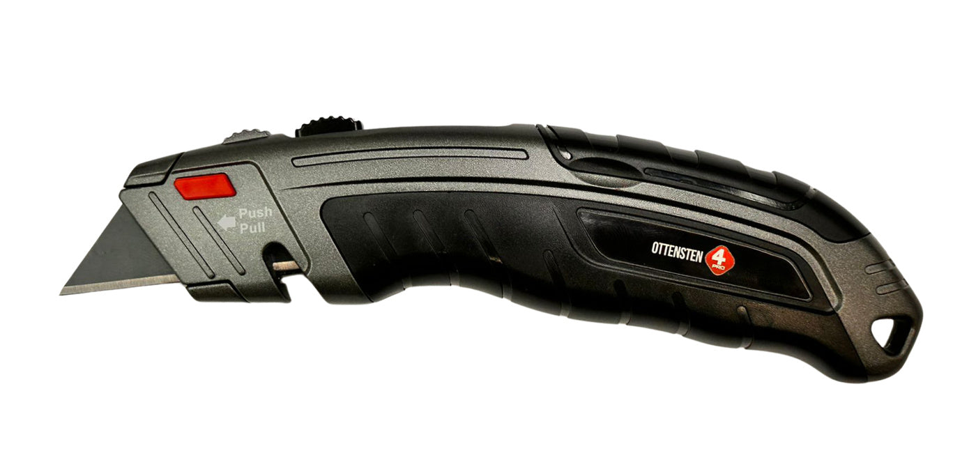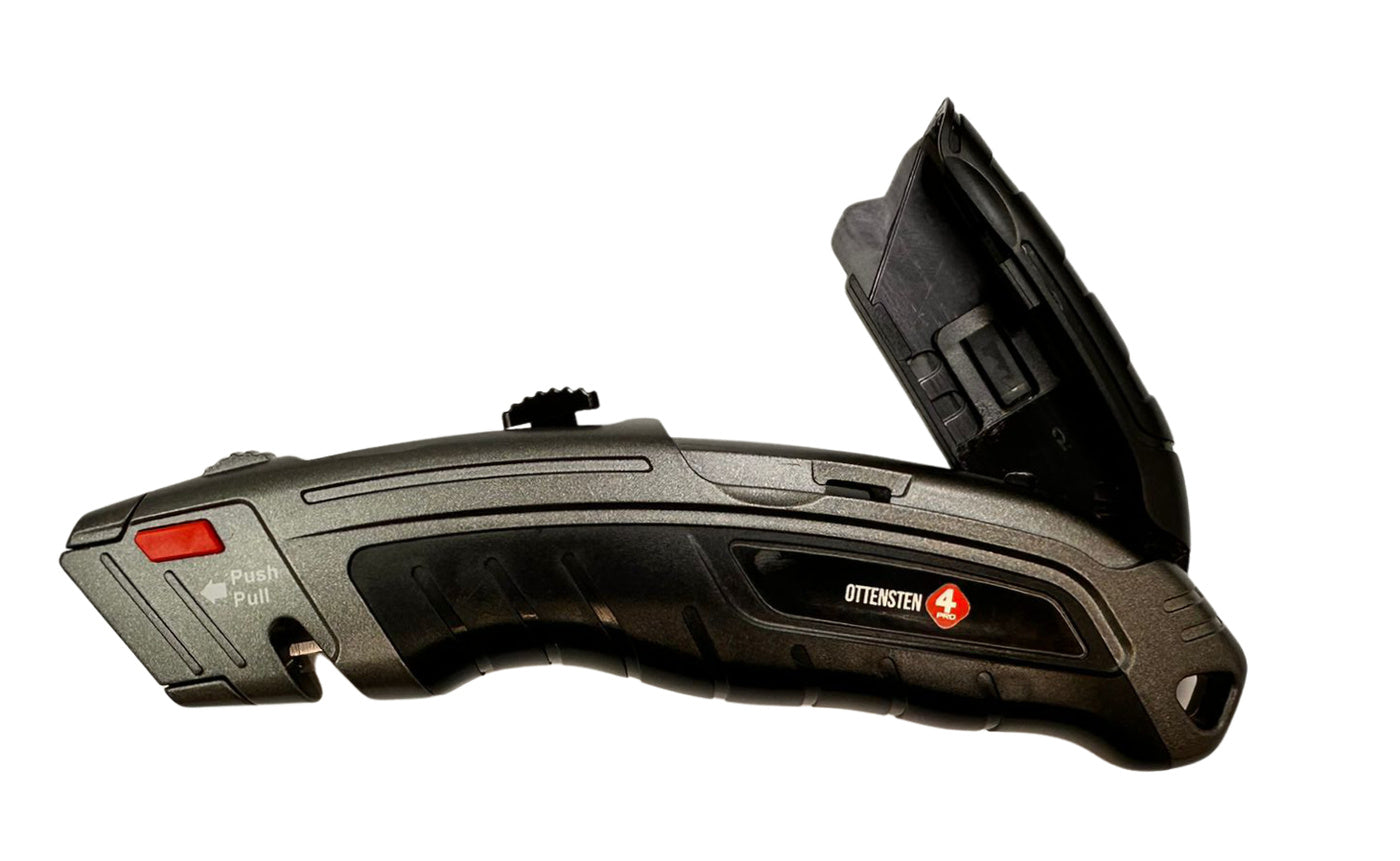 4PRO Heavy Duty trapezoid utility knife is designed for demanding construction and industrial work. The tool features a fully metal body that helps resist mechanical damage, drops, and harsh jobsite conditions. Its solid construction also helps stabilize the knife during cutting tasks.