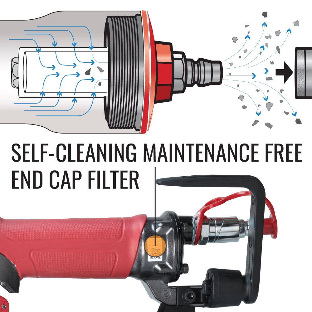 • savaiminio išsivalymo funkcija; filtras kiekvieną kartą atjungus oro žarną automatiškai išmeta pašalines medžiagas ir šiukšles iš įrankio;